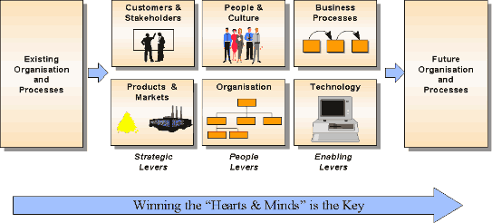 More recently, it has been recognised that, while CMMS can be a significant enabler of improved Maintenance performance, to achieve the maximum possible benefits from a CMMS implementation, business processes must be formally re-engineered, and work practices changed in a coordinated and planned manner if significant change is to be achieved. Thus was born the Business Process Re-engineering (BPR) approach to Systems Implementation, which focuses on both the Technology and the Business Processes involved in a CMMS implementation. However, even this BPR approach has, in recent years, become the subject of some debate, with many suggesting that this approach is not wholly successful in achieving long-term, sustainable benefits. Price Waterhouse has found that it is useful to consider effective organisational change as happening along six dimensions, called the 6 levers of change. These are illustrated below.