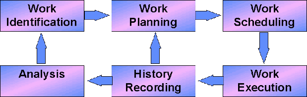 This framework suggests that the most effective way of introducing sustainable long-term, large-scale improvements in Maintenance performance is to pull all of these levers of change in a coordinated fashion. In addition, it is important to proactively manage the change in order to ensure that those affected by the change are committed to the change. Decisions regarding the strategic levers of change (Customers and Markets, and Products and Services) are outside the scope of this paper. Instead we will focus on the tactical levers of change. Maintenance Processes - A Framework for World Class MaintenanceIn general terms, the Maintenance management process can be considered as having six phases, as illustrated below.