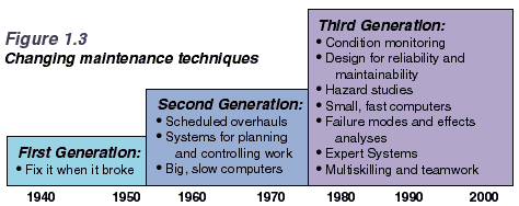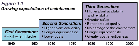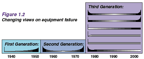 Introduction to Reliability-centered MaintenanceThis is an excerpt of the first chapter of the book "Reliability-centred Maintenance" by John Moubray. You may order this book through this website by clicking here.1.1 The Changing World of MaintenanceOver the past twenty years, maintenance has changed, perhaps more so than any other management discipline. The changes are due to a huge increase in the number and variety of physical assets (plant, equipment and buildings) which must be maintained throughout the world, much more complex designs, new maintenance techniques and changing views on maintenance organization and responsibilities.Maintenance is also responding to changing expectations. These include a rapidly growing awareness of the extent to which equipment failure affects safety and the environment, a growing awareness of the connection between maintenance and product quality, and increasing pressure to achieve high plant availability and to contain costs. The changes are testing attitudes and skills in all branches of industry to the limit. Maintenance people are having to adopt completely new ways of thinking and acting, as engineers and as managers. At the same time the limitations of maintenance systems are becoming increasingly apparent, no matter how much they are computerized. In the face of this avalanche of change, managers everywhere are looking for a new approach to maintenance. They want to avoid the false starts and dead ends which always accompany major upheavals. Instead they seek a strategic framework which synthesizes the new developments into a coherent pattern, so that they can evaluate them sensibly and apply those likely to be of most value to them and their companies. This book describes a philosophy which provides just such a frame-work. It is called Reliability-centered Maintenance, or RCM. If it is applied correctly, RCM transforms the relationships between the undertakings which use it, their existing physical assets and the people who operate and maintain those assets. It also enables new assets to be put into effective service with great speed, confidence and precision. This chapter provides a brief introduction to RCM, starting with a look at how maintenance has evolved over the past fifty years. 1.2 Reliability-centered MaintenanceSince the 1930's, the evolution of maintenance can be traced through three generations. RCM is rapidly becoming a cornerstone of the Third Generation, but this generation can only be viewed in perspective in the light of the First and Second Generations.The First Generation The First Generation covers the period up to World War II. In those days industry was not very highly mechanized, so downtime did not matter much. This meant that the prevention of equipment failure was not a very high priority in the minds of most managers. At the same time, most equipment was simple and much of it was over-designed. This made it reliable and easy to repair. As a result, there was no need for systematic maintenance of any sort beyond simple cleaning, servicing and lubrication routines. The need for skills was also lower than it is today. The Second Generation Things changed dramatically during World War II. Wartime pressures increased the demand for goods of all kinds while the supply of industrial manpower dropped sharply. This led to increased mechanization. By the 1950's machines of all types were more numerous and more complex. Industry was beginning to depend on them. As this dependence grew, downtime came into sharper focus. This led to the idea that equipment failures could and should be prevented, which led in turn to the concept of preventive maintenance. In the 1960's, this consisted mainly of equipment overhauls done at fixed intervals. The cost of maintenance also started to rise sharply relative to other operating costs. This led to the growth of maintenance planning and control systems. These have helped greatly to bring maintenance under control, and are now an established part of the practice of maintenance. Finally, the amount of capital tied up in fixed assets together with a sharp increase in the cost of that capital led people to start seeking ways in which they could maximize the life of the assets. The Third Generation Since the mid-seventies, the process of change in industry has gathered even greater momentum. The changes can be classified under the headings of new expectations, new research and new techniques.< Figure 1. 1 shows how expectations of maintenance have evolved. ![]() Downtime has always affected the productive capability of physical assets by reducing output, increasing operating costs and interfering with customer service. By the 1960's and 1970's, this was already a major concern in the mining, manufacturing and transport sectors. In manufacturing, the effects of downtime are being aggravated by the worldwide move towards just-in-time systems, where reduced stocks of work-in-progress mean that quite small breakdowns are now much more likely to stop a whole plant. In recent times, the growth of mechanization and automation has meant that reliability and availability have now also become key issues in sectors as diverse as health care, data processing, telecommunications and building management. Greater automation also means that more and more failures affect our ability to sustain satisfactory quality standards. This applies as much to standards of service as it does to product quality. For instance, equipment failures can affect climate control in buildings and the punctuality of transport networks as much as they can interfere with the consistent achievement of specified tolerances in manufacturing. More and more failures have serious safety or environmental consequences, at a time when standards in these areas are rising rapidly. In some parts of the world, the point is approaching where organizations either conform to society's safety and environmental expectations, or they cease to operate. Th