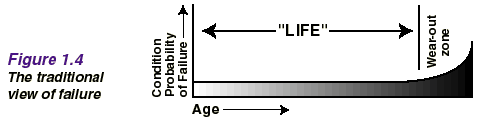 The consequence evaluation process is discussed again briefly later this chapter, and in much more detail in Chapter 5 of the book. The next section of this chapter looks at proactive tasks in more detail. Proactive Tasks Many people still believe that the best way to optimize plant availability is to do some kind of proactive maintenance on a routine basis. Second Generation wisdom suggested that this should consist of overhauls of component replacements at fixed intervals. Figure 1.4 illustrates the fixed interval view of failure. ![]() Figure 1.4 is based on the assumption that most items operate reliably for a period of time, and then wear out. Classical thinking suggests that extensive records about failure will enable us to determine this life and so make plans to take preventive action shortly before the item is due to fail in future. This model is true for certain types of simple equipment, and for some complex items with dominant failure modes. In particular, wear-out char-acteristics are often found where equipment comes into direct contact with the product. Age-related failures are also often associated with fatigue, corrosion, abrasion and evaporation. However, equipment in general is far more complex than it was twenty years ago. This has led to startling changes in the patterns of failure, as shown in Figure 1.5. The graphs show conditional probability of failure against operating age for a variety of electrical and mechanical items. ![]() Pattern A is the well-known bathtub curve. It begins with a high incidence of failure (known as infant mortality) followed by a constant or gradually increasing conditional probability of failure, then by a wear-out zone. Pattern B shows constant or slowly increasing conditional prob-ability of failure, ending in a wear-out zone (the same as Figure 1.4). Pattern C shows slowly increasing conditional probability of failure, but there is no identifiable wear-out age. Pattern D shows low conditional probability of failure when the item is new or just out of the shop, then a rapid increase to a constant level, while pattern E shows a constant conditional probability of failure at all ages (random failure). Pattern F starts with high infant mortality, which drops eventually to a constant or very slowly increasing conditional probability of failure. Studies done on civil aircraft showed that 4% of the items conformed to pattern A, 2% to B, 5% to C, 7% to D, 14% to E and no fewer than 68% to pattern F. (The number of times these patterns occur in aircraft is not necessarily the same as in industry. But there is no doubt that as assets become more complex, we see more and more of patterns E and F.) These findings contradict the belief that there is always a connection between reliability and operating age. This belief led to the idea that the more often an item is overhauled, the less likely it is to fail. Nowadays, this is seldom true. Unless there is a dominant age-related failure mode, age limits do little or nothing to improve the reliability of complex items. In fact scheduled overhauls can actually increase overall failure rates by introducing infant mortality into otherwise stable systems. An awareness of these facts has led some organizations to abandon the idea of proactive maintenance altogether. In fact, this can be the right thing to do for failures with minor consequences. But when the failure consequences are significant, something must be done to prevent or predict the failures, or at least to reduce the consequences. This brings us back to the question of proactive tasks. As mentioned earlier, RCM divides proactive tasks into three categories, as follows: