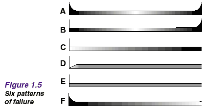 In the world of RCM, failed states are known as functional failures because they occur when an asset is unable to fulfill a function to a standard of performance which is acceptable to the user. In addition to the total inability to function, this definition encompasses partial failures, where the asset still functions but at an unacceptable level of performance (including situations where the asset cannot sustain acceptable levels of quality or accuracy). Clearly these can only be identified after the functions and performance standards of the asset have been defined. Functional failures are discussed at greater length in Chapter 3 of the book. Failure Modes As mentioned in the previous paragraph, once each functional failure has been identified, the next step is to try to identify all the events which are reasonably likely to cause each failed state. These events are known as failure modes. "Reasonably likely" failure modes include those which have occurred on the same or similar equipment operating in the same context, failures which are currently being prevented by existing maintenance regimes, and failures which have not happened yet but which are considered to be real possibilities in the context in question. Most traditional lists of failure modes incorporate failures caused by deterioration or normal wear and tear. However, the list should include failures caused by human errors (on the part of operators and maintainers) and design flaws so that all reasonably likely causes of equipment failure can be identified and dealt with appropriately. It is also important to identify the cause of each failure in enough detail to ensure that time and effort are not wasted trying to treat symptoms instead of causes. On the other hand, it is equally important to ensure that time is not wasted on the analysis itself by going into too much detail. Failure Effects The fourth step in the RCM process entails listing failure effects, which describe what happens when each failure mode occurs. These descriptions should include all the information needed to support the evaluation of the consequences of the failure, such as: