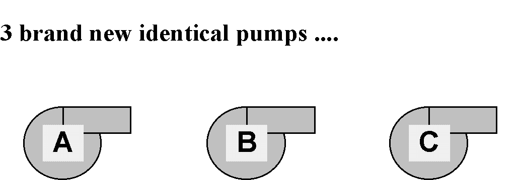 This paper outlines the experiences of those organisations that are well advanced in the implementation of Third Generation Maintenance principles, and puts forward the a view of what the Fourth Generation of Maintenance may be. But first, let's examine the goals of zero downtime or zero in-service breakdowns - is this achievable, or, indeed, desirable? IS THE OBJECTIVE OF MAINTENANCE TO PREVENT ALL FAILURES?Many organisations (particularly those who have been converted to the "religion" of Total Productive Maintenance (TPM) have stated one of their maintenance goals as being the achievement of zero breakdowns - zero in-service failures. Putting to one side, for the moment, the question of whether, in practice, this is actually achievable, let's first address the question of whether this is desirable. Consider, for example, a fixed plant situation where there are three brand new, identical pumps all pumping the same quantity of the same fluid against the same head, as illustrated below.