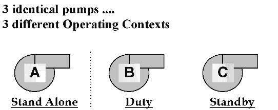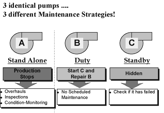 In this instances, if we consider the consequences of failure in each of the three cases, we will end up with three quite different maintenance programs for each of the three pumps, as illustrated below.