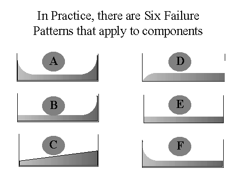 Hence the consequences of failure have a large bearing on the appropriate maintenance program to adopt for any item of equipment (and this in turn is affected by the operating context within which the equipment is asked to operate). The second key point from this example is that if you had established the maintenance program for Pumps B & C with the objective of eliminating in-service breakdowns of this equipment, then you would have been indulging in significant over-maintenance of those equipment items. Clearly, performing routine overhauls, condition-monitoring and inspections is significantly more expensive than repairing the item only after it has failed - and yet the additional expenditure on these activities yields no additional operational benefit. So to sum up, the objective of maintenance is not to eliminate all failures, but it is to eliminate the consequences of failure. BUT WHAT ABOUT FAILURES WITH SAFETY CONSEQUENCES?Ah yes, I hear you say, but what about those failures that have safety consequences, where a failure could possibly result in serious injury or death - surely in these circumstances the objective of maintenance is to eliminate these failures. Well let's examine this a bit further.Research in the airline industry in the 1960's and 1970's, which led to the development of Reliability Centred Maintenance principles, showed that there are 6 possible failure patterns that can apply to components. These are illustrated below.